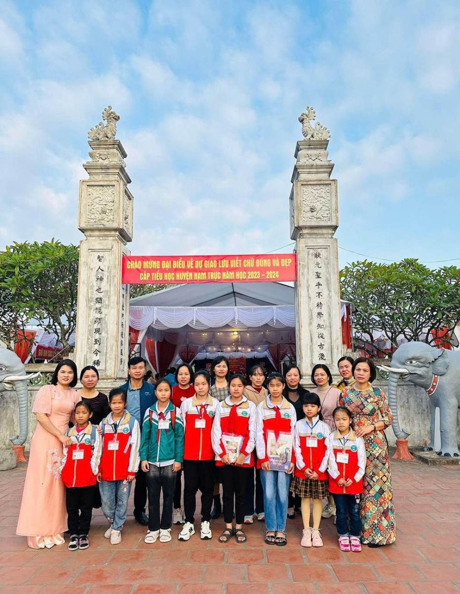 Cô giáo Vũ Thị Duyên, Nguyễn Thị Thành – GV tổ 4 cùng học sinh tham dự Giao lưu viết chữ đúng và đẹp cấp huyện tại đền Trạng nguyên Nguyễn Hiền năm học 2023 – 2024