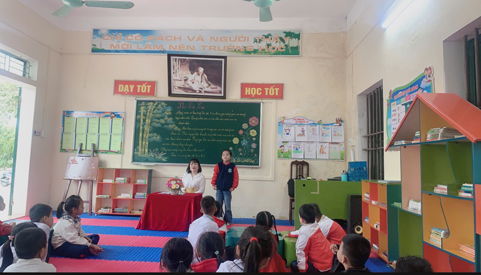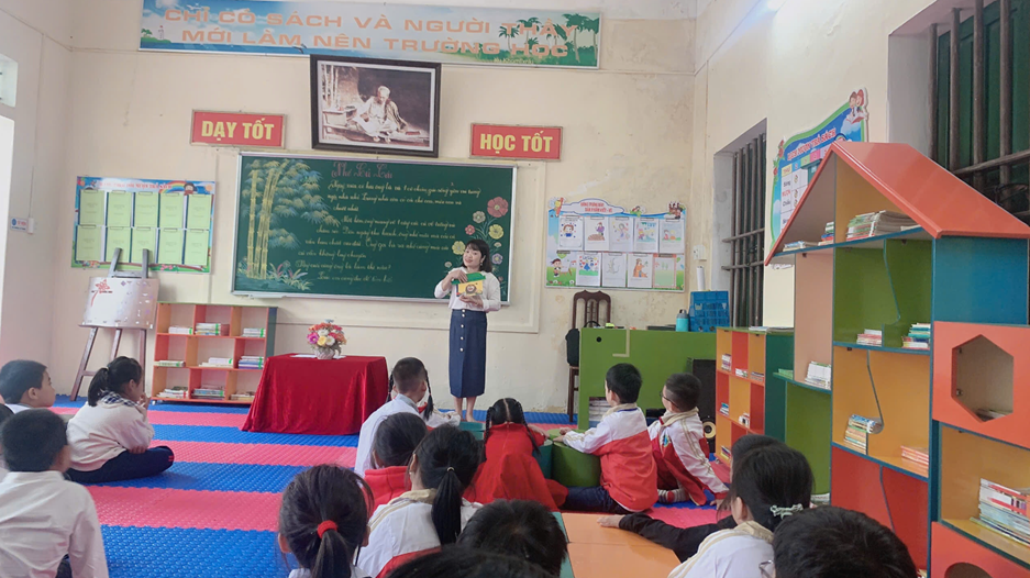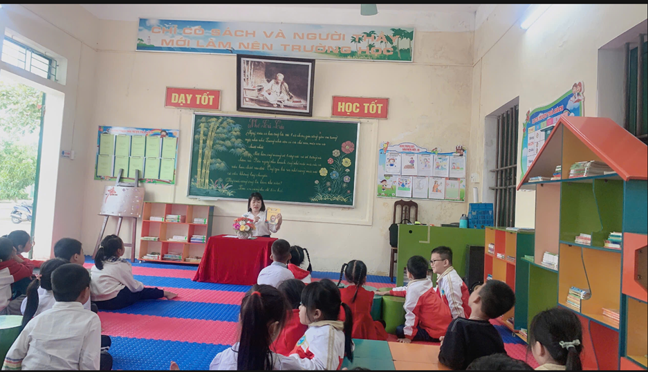 Cô giáo Hoàng Thị Cúc – GV Mĩ thuật – phần thi tiết dạy Đọc thư viện.