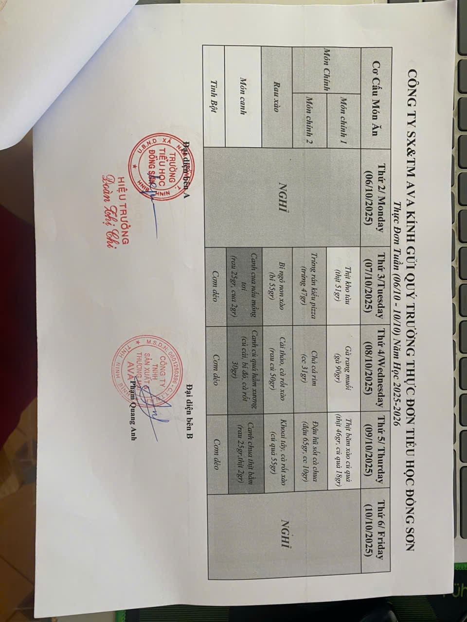 THỰC ĐƠN BẾP ĂN BÁN TRÚ TUẦN 1 THÁNG 10 NĂM 2025