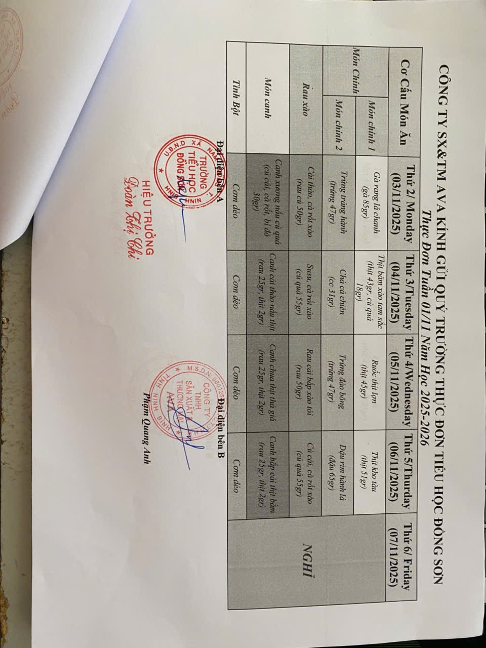 THỰC ĐƠN BẾP ĂN BÁN TRÚ TUẦN 1 THÁNG 11 NĂM 2025