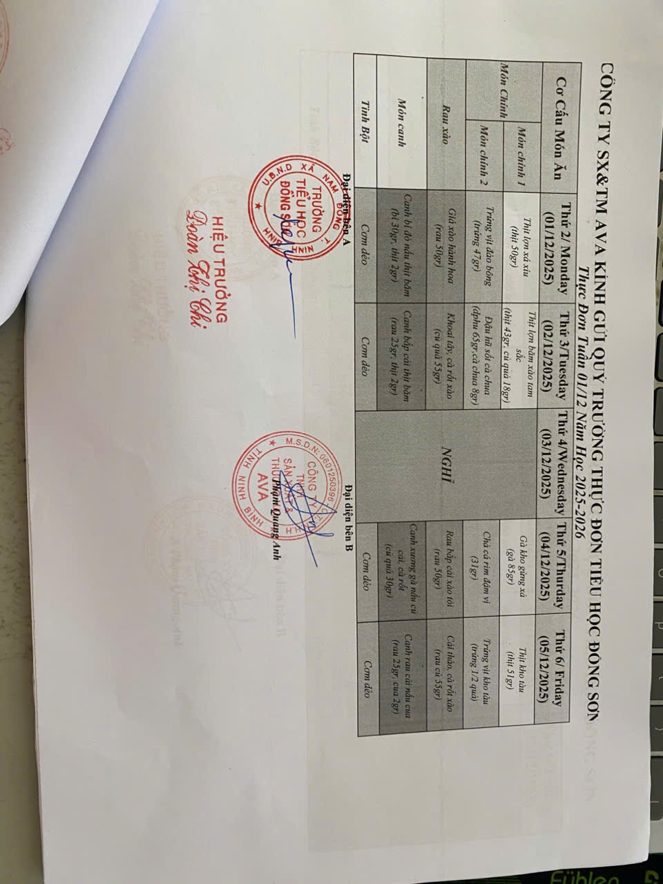 THỰC ĐƠN BẾP ĂN BÁN TRÚ TUẦN 1 THÁNG 12 NĂM 2025