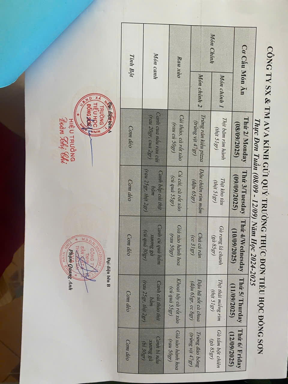 THỰC ĐƠN BẾP ĂN BÁN TRÚ TUẦN 1 tháng 9 năm 2025