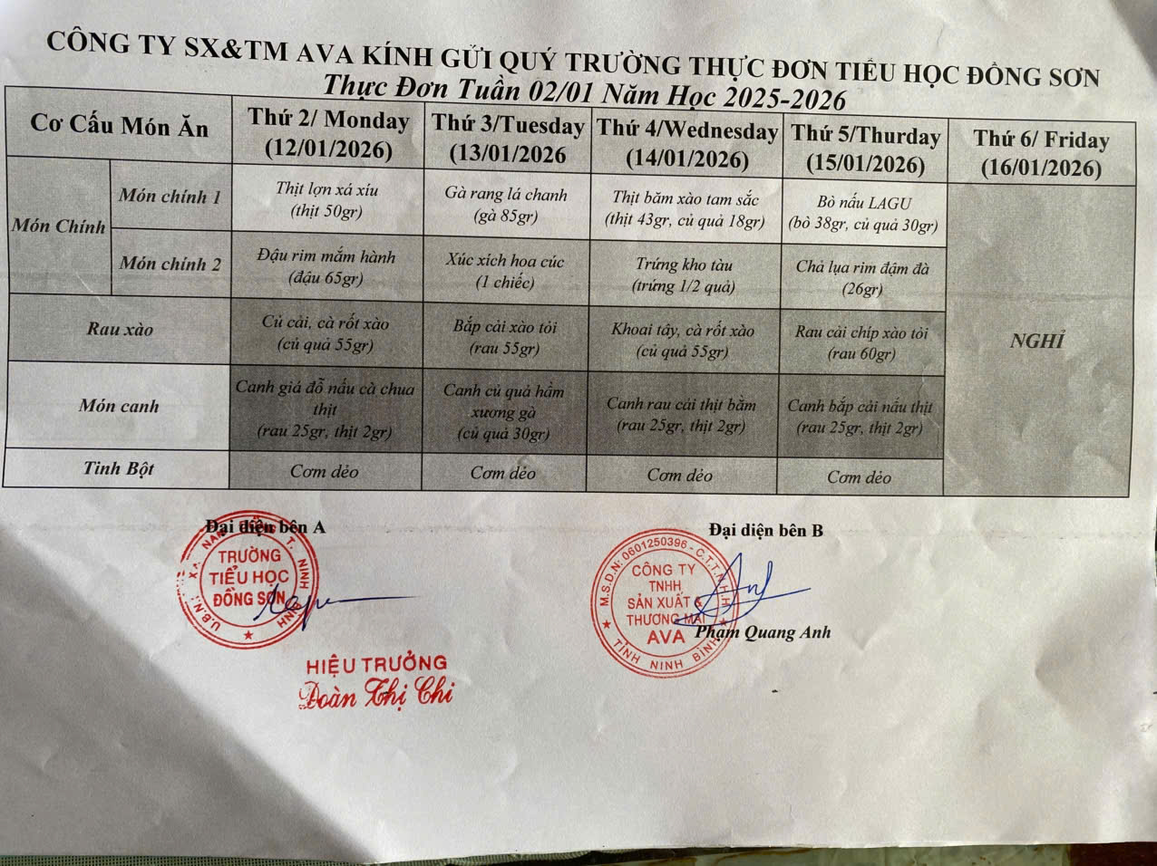 THỰC ĐƠN BẾP ĂN BÁN TRÚ TUẦN 2 THÁNG 1 NĂM 2026