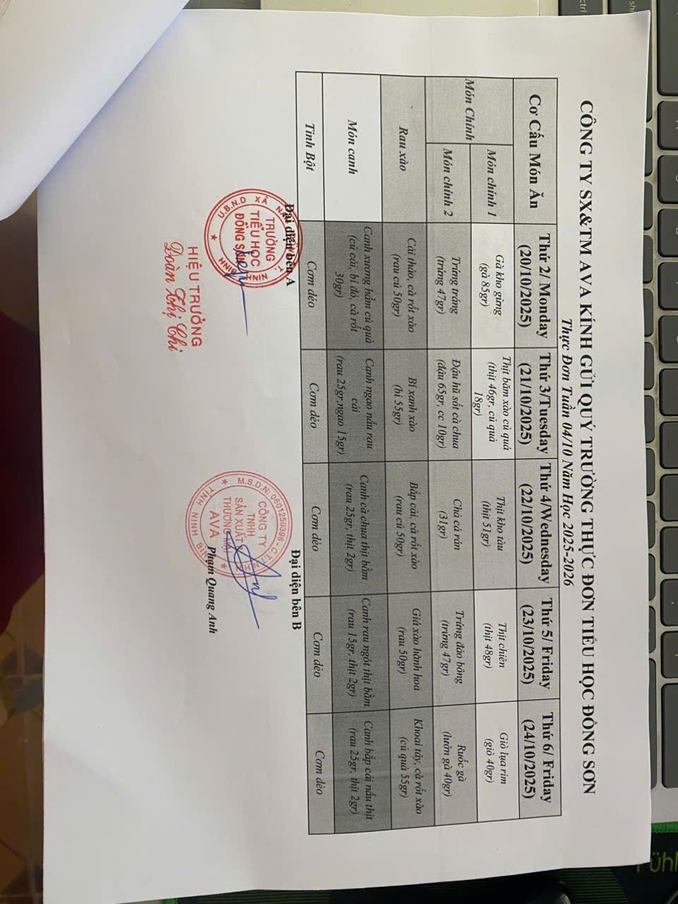 THỰC ĐƠN BẾP ĂN BÁN TRÚ TUẦN 4 THÁNG 10 NĂM 2025