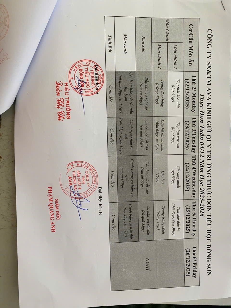 THỰC ĐƠN BẾP ĂN BÁN TRÚ TUẦN 4 THÁNG 12 NĂM 2025