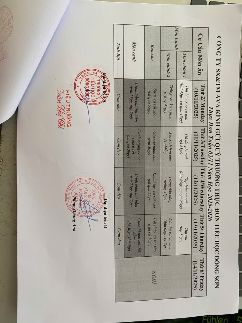 THỰC ĐƠN BẾP ĂN BÁN TRÚ TUẦN 2 THÁNG 11 NĂM 2025