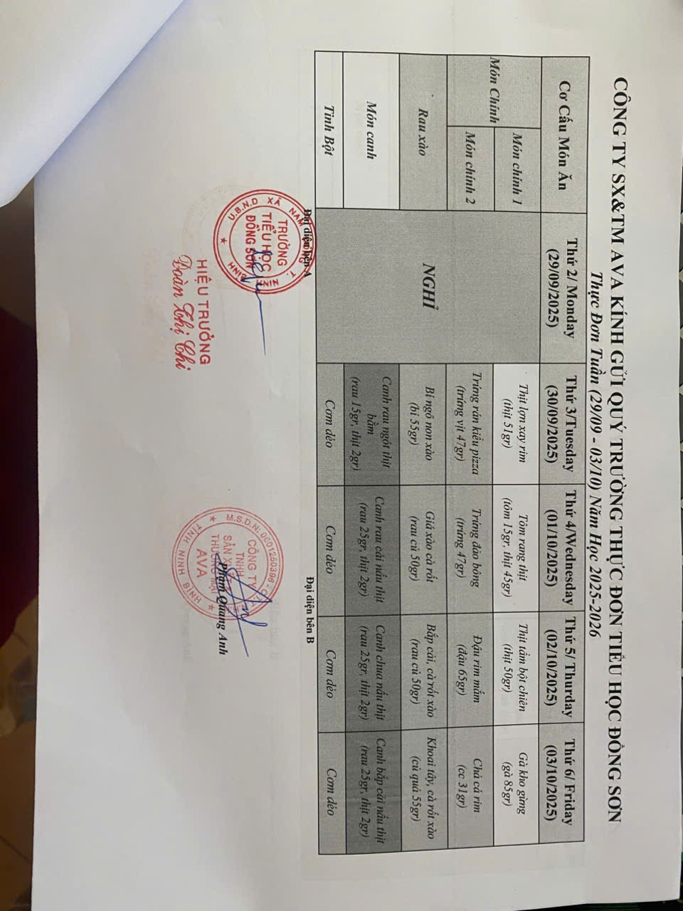 THỰC ĐƠN BẾP ĂN BÁN TRÚ TUẦN 5 THÁNG 9 NĂM 2025