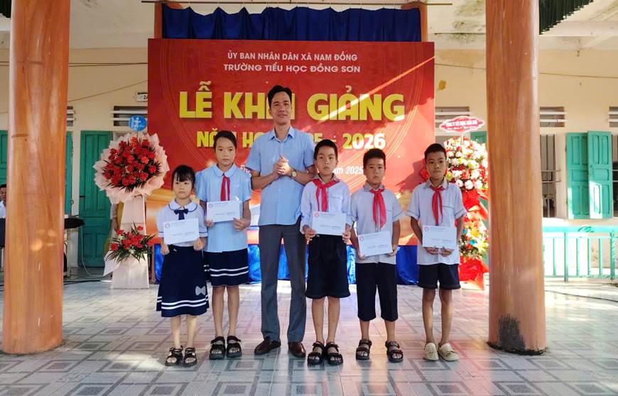 Với sự quan tâm của nhà tài trợ và Hội Khuyến học tỉnh Ninh Bình nhà trường có 5 em học sinh được nhận học bổng “Học không bao giờ cùng” cho học sinh vượt khó, hiếu học năm 2025. Bác Vũ Thanh Hải – Phó Bí thư thường trực xã Nam Đồng lên trao quà cho các em.